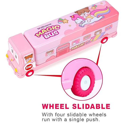 2 in 1 - Cartoon Printed School Bus Metal Pencil Box with Moving Tyres & Sharpner for Kids, Metal Compass Box, Return Gift For Kid